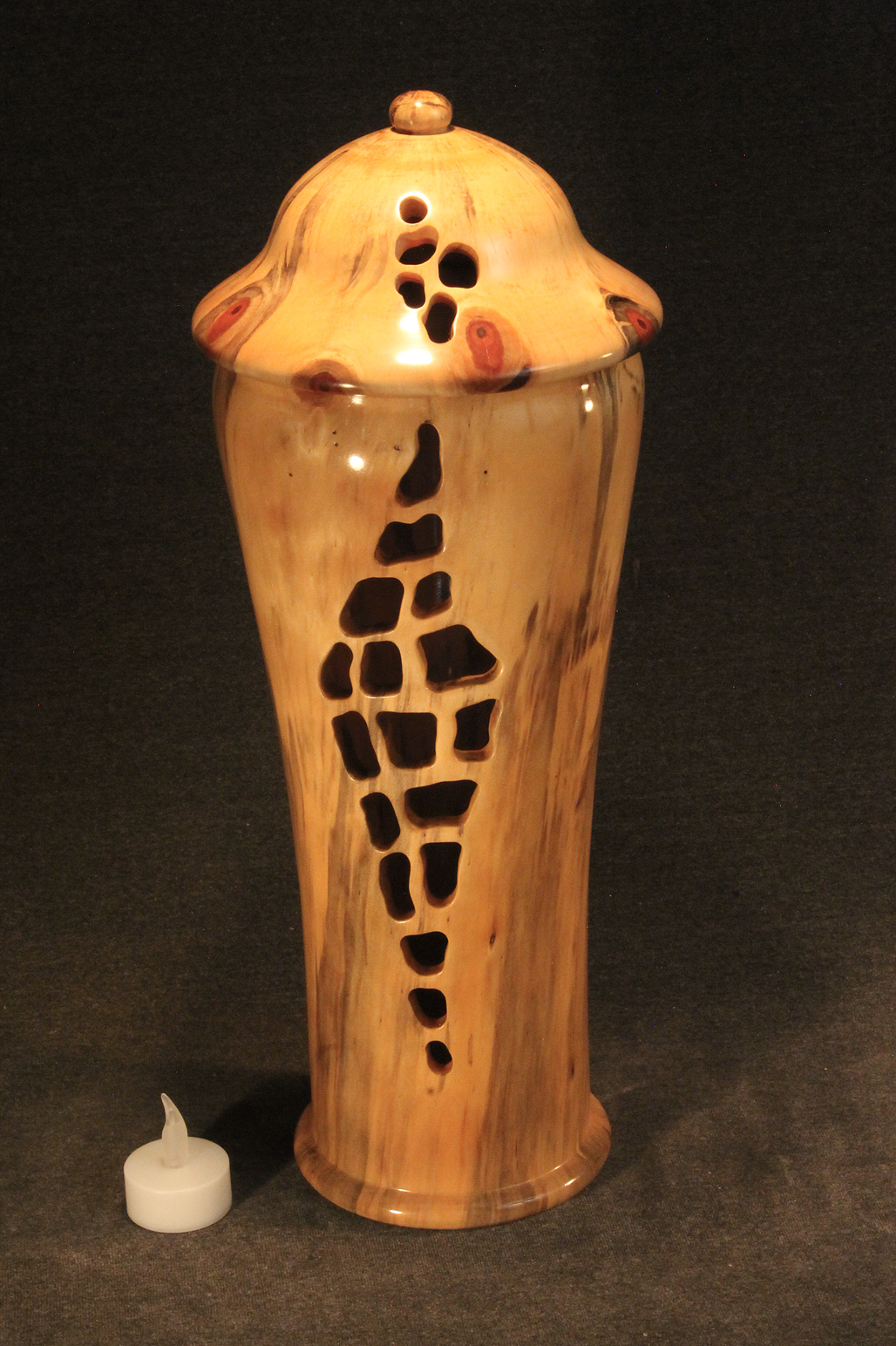 This is a 15" "Lantern" designed to be used with LED candles. I turned it from one Norfolk Island log. It was great fun and has made a beautiful piece. It's spectacular when the lights are low and the electric candle inside is flickering.